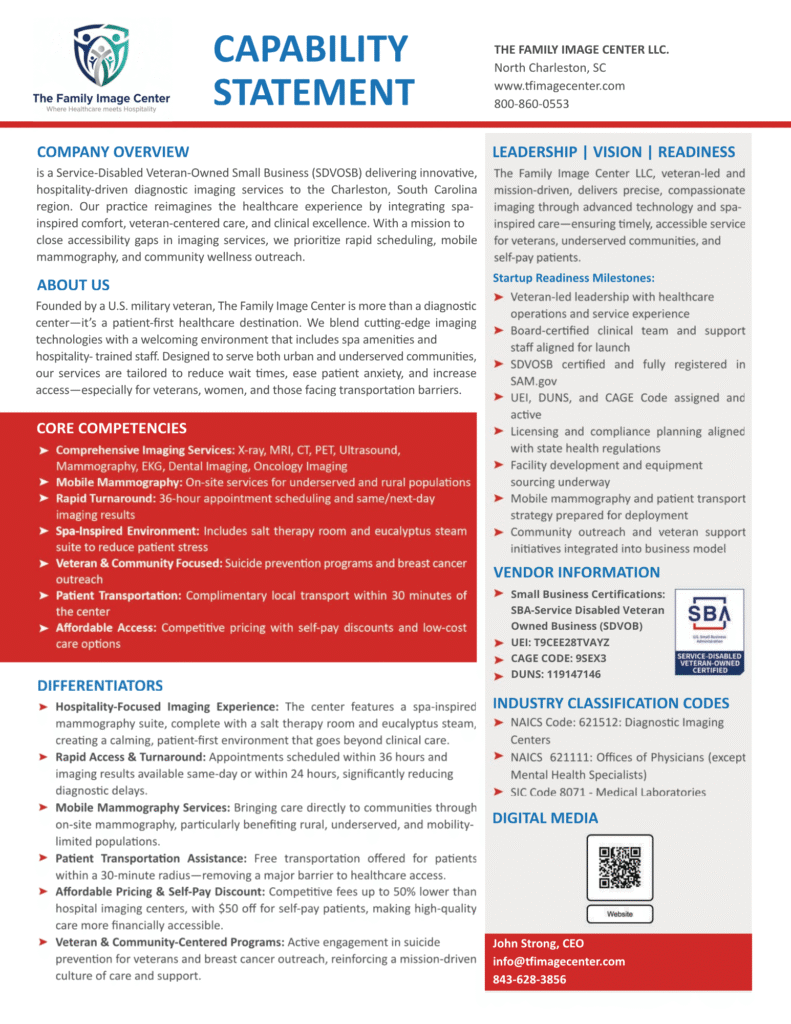 Our business is The Family Image Center LLC, located in N. Charleston, SC 29406 and Future locations: Winnsboro, SC, and Marion, SC. The services we offer are Xray, MRI, Catscan, Sonograms, Mammography and Pet scan and dental.
